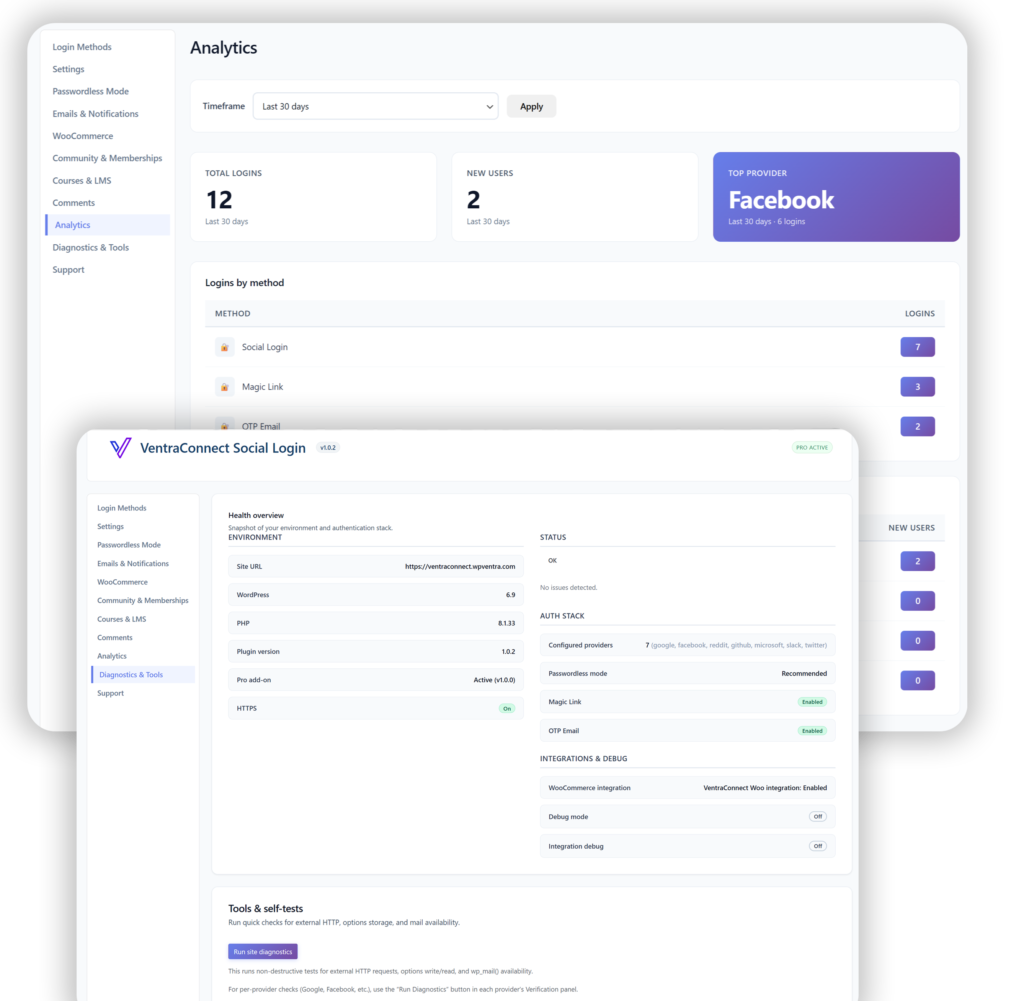 One unified login system for WordPress core, WooCommerce, membership plugins, and course platforms.