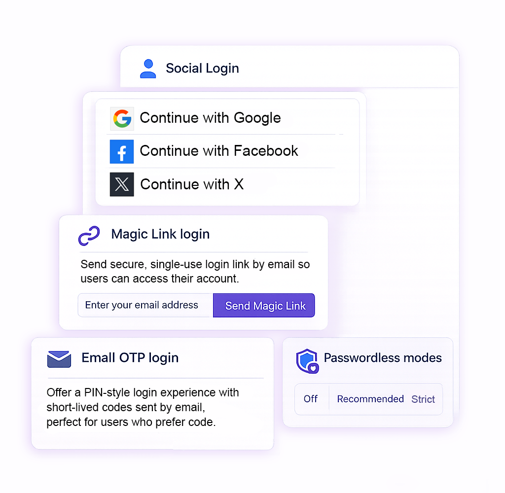 Combine Social Login, Magic Link, and OTP with passwordless controls tailored to your site.